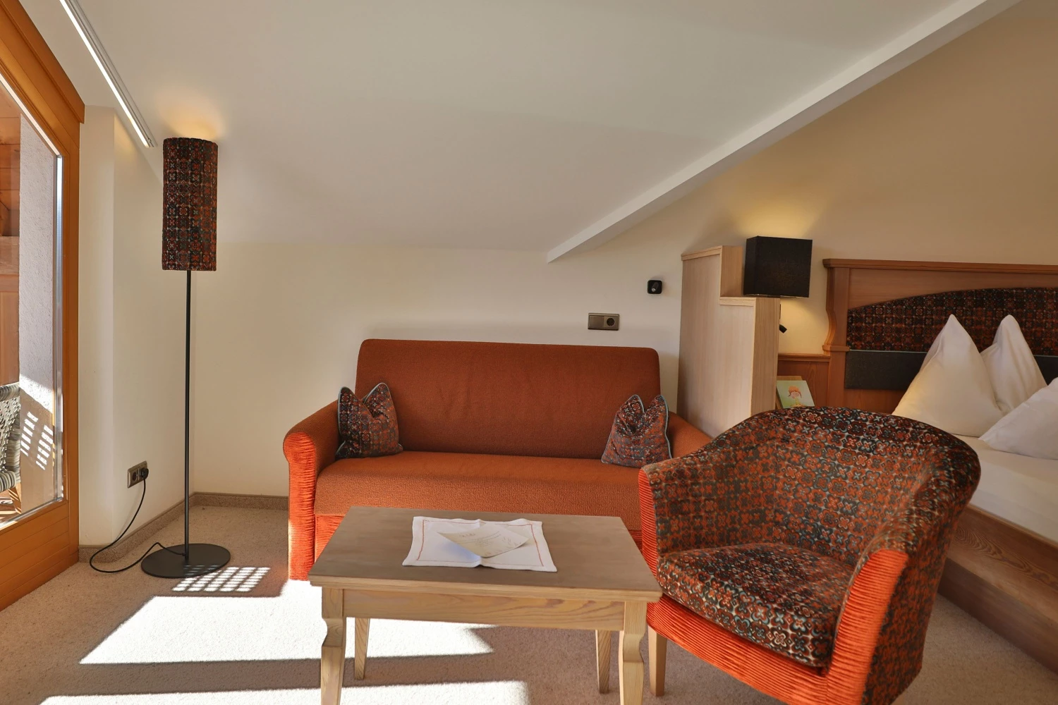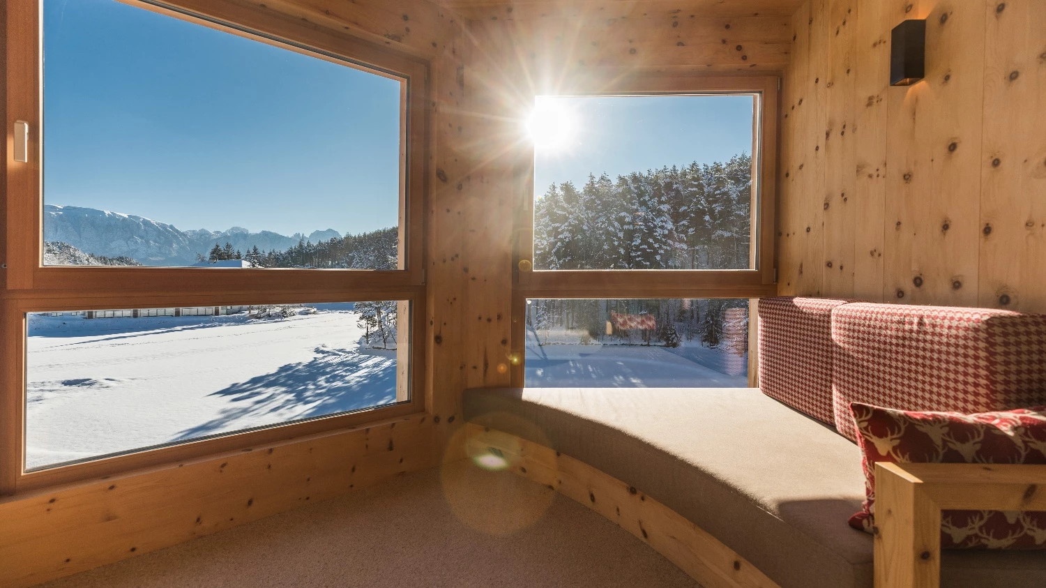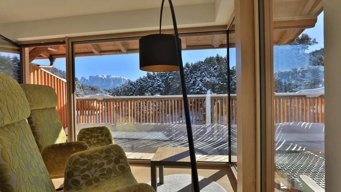 Südtiroler Holz, weiche Stoffe, warmes Licht – das Draußen zieht mit ein.