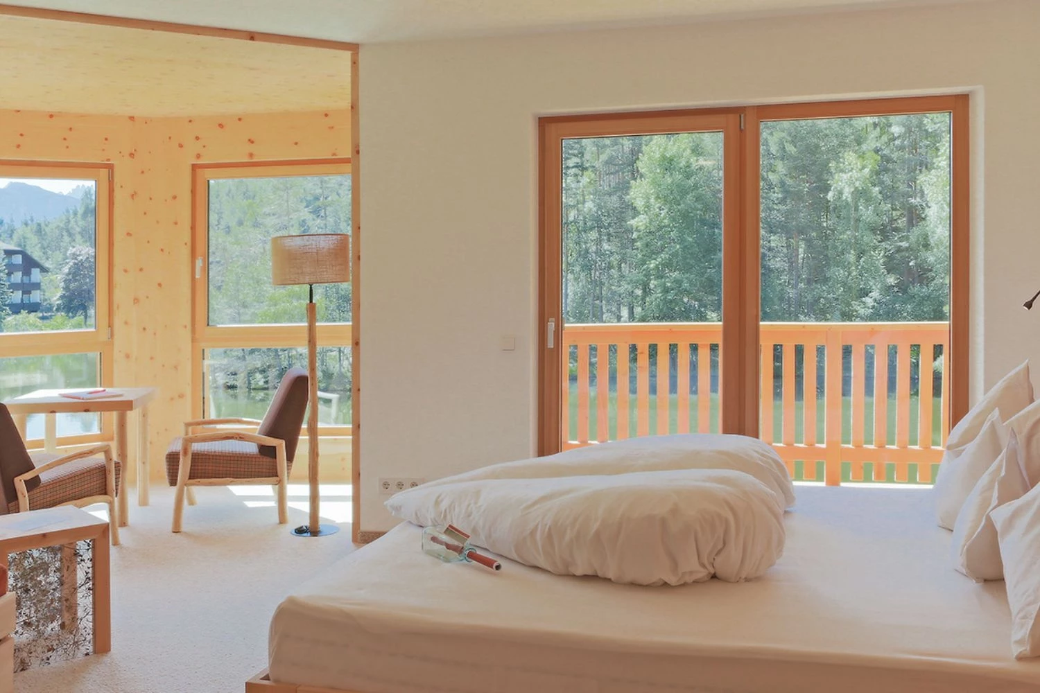 Vom Balkon geht der Blick hinaus auf den See oder in den Wald.